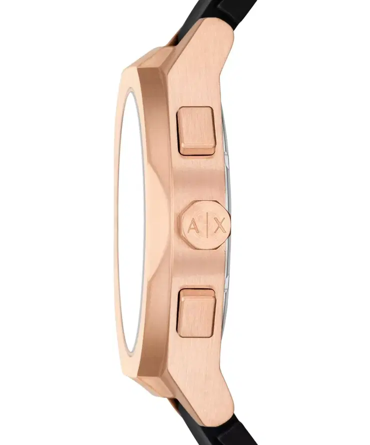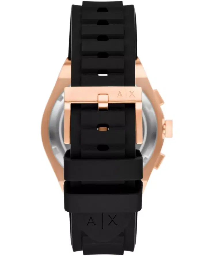 1-4 working days.The Armani Exchange Sync Chronograph watch blends bold modern style with sporty functionality. Designed with a striking rose gold-tone stainless steel case and a comfortable black silicone strap, this watch delivers a powerful contemporary look.