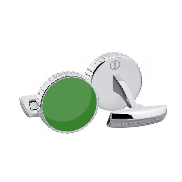 The round design is enhanced with a striking green inlay center, creating a sophisticated contrast that adds character and individuality to formal attire. The textured edge detail further enhances the luxurious appearance of the cufflinks while maintaining a clean and contemporary aesthetic.