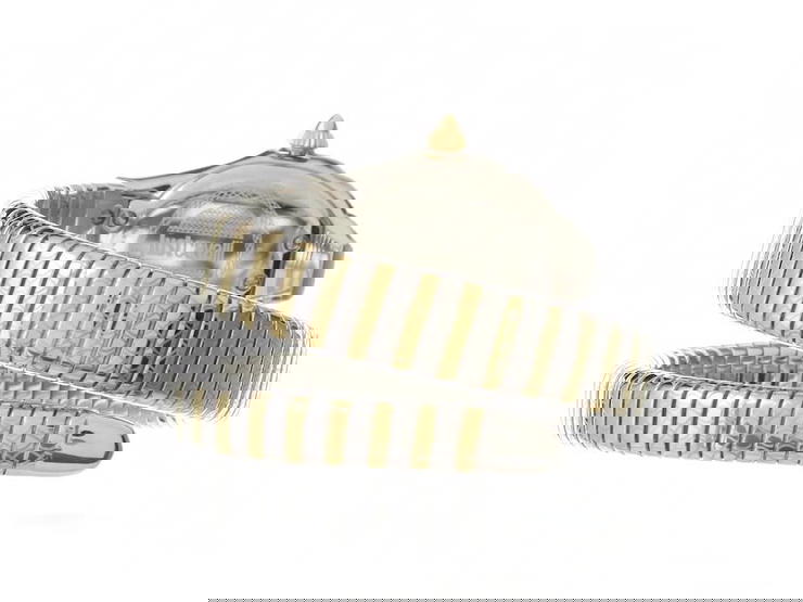 Crafted in stainless steel with an eye catching two tone finish of silver and gold, the flexible snake style bracelet adds both comfort and striking visual appeal. The sculpted case features a geometric dial accented with gold tone hands and minimalist hour markers for a refined and contemporary look.